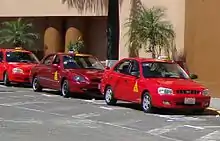 Costa Rican taxis are colored red. Usual cars for taxi use are Hyundai Accents, Toyota Coraxi (a cab version of the Toyota Corolla) and the Nissan Sentra (B13).