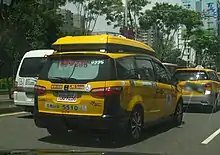Most taxicabs in the Philippines are white with black text, the exception is for airport taxis which are usually yellow. On the sides of the cab, the taxi service and its operator licensing numbers are listed. On the back of the cab, a question "How's my driving" and a hotline number is posted for complaints against the cab driver and operator.
