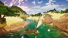 Tchia can explore the archipelago in her human form. She is equipped with a glider and a raft which allows her to navigate between places quickly.[6] Tchia is highly acrobatic. She can quickly slide down a mountain, climb up trees and use it to catapult herself across the canopy, and ascend nearly all types of surfaces. Through exploration, players will discover different points of interest, minigames, and chests with cosmetic items, meet other non-playable characters, and complete side quests.[4] Tchia features elements from rhythm games, as players can play Tchia's ukelele at will. Players can play "Soul-Melodies", which allows Tchia to perform feats such as summoning animals for soul jumping, altering the time of day, or changing the in-game weather.[5][7] These gameplay sequences are skippable.[8] Tchia's appearance, as well as her glider and her raft, can be extensively customized.[9]