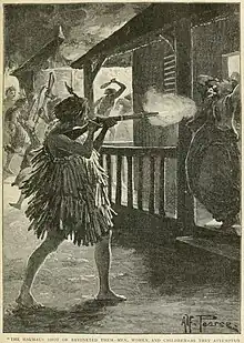 Te Kooti in the meantime had reached Patutahi, a village in the western hills overlooking Poverty Bay.[24] Tūranga, on the mouth of the Waimata River, and nearby Matawhero, was home to about 150 European settlers and 500 Māori. Many of the men responsible for Te Kooti's exile to the Chatham Islands lived in the area.[25] From Patutahi, on the night of 9 November, Te Kooti led a 100-strong kokiri (attack party) into Poverty Bay. The kokiri was split into several smaller contingents and struck several properties in the area.[22] The party led by Te Kooti surrounded Biggs' home at Matawhero where he, his wife, their baby and servants were fatally shot, clubbed and bayoneted. Another party, led by Nama, attacked the family of Captain James Wilson, killing him, a servant and three of his four children and fatally wounding his wife. The attackers moved on to other homes, slaughtering the families of other settlers who had fought with the militia forces and setting fire to their houses.[26] Many of the killings were followed by the singing of Psalm 63, which concluded: "They who seek my life will be destroyed ... they will be given over to the sword and become food for jackals."[27] Around 30 settlers, mostly younger men in the militia, were killed as well as 37 Māori.[28][29]