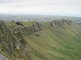 Te Mata Peak is a peak south of Hastings rising up to 399m in the Te Mata Hills in the Hawke's Bay region of New Zealand.[1] A sealed road leads to the popular lookout at the summit, as well as many trails for hikers and mountain bikers.[2] The Hastings suburb of Havelock North is situated at the base of the peak. Te Mata peak and the surrounding range runs in a North-East to South-West direction. The slopes on the North-Western side build up gradually. Havelock North is built upon the rolling hills at the lower extent of the ranges. The topography of the South-Eastern side has been heavily influenced by the Tukituki River, forming the Tukituki Valley. From Te Mata Peak, cliffs on the South-Eastern side drop 140 meters before extending into the rolling hills of the Tukituki Valley, making these cliffs some of the highest in the North Island of New Zealand. Their height is subject to erosion, with multiple instances of rockfall into the valley below. From the peak, large boulders can be witnessed in the valley as evidence of previous rockfall.