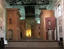 In the 17th century, Scamozzi's original scenery was removed and replaced by a new system with sliding wings.[3] However, his original plans—which are shown above—were preserved in the archives at the Uffizi in Florence, making it possible, in the twentieth century, for new scenery to be rebuilt based on the original plans and added to the theatre.