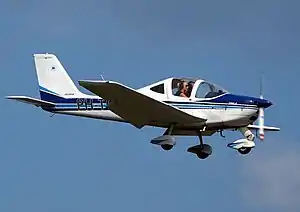 Each aircraft is typically powered by a single Rotax 912 S2 engine, capable of 100 hp (75 kW).[2] In a standard configuration, the engine drives a three-blade fixed-pitch propeller; various alternative propellers can be installed, including both fixed-pitch and variable-pitch models along with two and three-bladed models. The engine is controlled via a pair of push/pull throttle levers, one being centrally mounted at the instrument panel's base and the other to the left of the instrument console, there is no mixture control present.[2] Heating of the cockpit is provided via ducted air from the engine, while cooling and ventilation is provided by multiple side louvers.[2] The cockpit is covered by a sliding bubble canopy, this can be opened mid-flight if desired,[5][6][7][8][9] although the presence of both a top lock and two side safety locks prevent the canopy opening unintentionally. Even when closed, the bubble canopy reportedly provides excellent levels of external visibility to the pilot.[2]