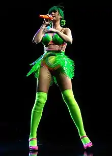 On February 13, 2011, Perry performed "Teenage Dream" at the 53rd Annual Grammy Awards.[56] The song was featured on the set list of the California Dreams Tour in 2011 as the opening act of the show. The show begins with a video screen introduction which tells the story of a girl named Katy who lives in a colorless world wasting her life cutting meat for a mean old butcher. One night, Perry escapes her dreadful reality by falling asleep and visiting a vibrant candy land in search of her pet cat, Kitty Purry and also of the love of her life, the Baker's Boy, played by Nick Zano. Perry then appears on stage and starts performing "Teenage Dream" with her dancers, while wearing a white dress with spinning peppermints.[57] For Obama's 2012 presidential candidacy, Perry performed several of her hit songs dressed as a ballot, including "Teenage Dream", "Firework", and "Wide Awake". Expressing solidarity for his campaign, the box next to Obama's name was shaded.[58][59] For her 2014–15 The Prismatic World Tour[60] and her 2017-2018 Witness: The Tour, "Teenage Dream" was included on the setlist.