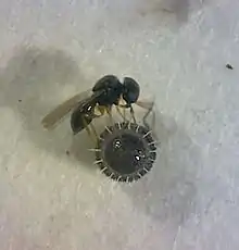 Telenomus podisi is a species of egg parasitoid wasps described by William Harris Ashmead in 1893 and placed in the family of Platygastridae.[1] It is a parasitoid of the brown stink bug, Euschistus heros[2] and can be raised in labs on the eggs of Cosmopepla lintneriana, Podisus maculiventris, and Euschistus servus. [3] This wasp can be used in integrated pest management to control E. heros.[4] The insecticide Imidacloprid is lethal for these wasps, and other insecticides have been shown to negatively impact rates of egg parasitism.[5]