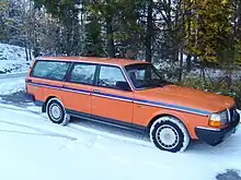 A Volvo 245 GL station wagon from 1988 in its distinctive hi-vis orange livery used as a service vehicle by Televerket and Telia. The blue cheatline was later added to the exterior in the early-1990s after the corporatisation of Televerket into Telia.