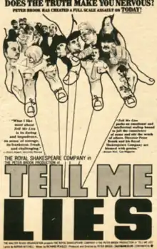 Tell Me Lies, also known as Us, is a 1968 British documentary drama film directed and produced by Peter Brook. Based on the 1966 play US by Denis Cannan, it stars Mark Jones, Pauline Munro, Eric Allan, and Robert Langdon Lloyd.[1] It was shot in London in the summer of 1967 and starred actors under contract to the Royal Shakespeare Company.[2] The film looks at reactions to the American involvement in the Vietnam War and was highly controversial at the time of its release.