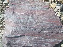 Banded iron formation in the North Pit area of Sherman Mine, showing the red lateral lines of jasper and grey lateral lines of magnetite typical of Neoarchean (2,800–2,500 million year old) banded iron formations