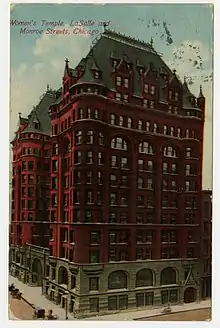 Temperance Temple (also known as Women's Temple or Woman's Temple) served as the headquarters of the National Woman's Christian Temperance Union (WCTU). It was located in Chicago, Illinois at the southwest corner of LaSalle Street and Monroe Street, in the center of city's financial district. Work was begun in July, 1890, and the building was ready for occupancy in May 1892.[1] The lot was valued at US$1,000,000; the rentals from the building were expected to bring in an annual income of over US$200,000. The capital stock was US$600,000, one-half of which was owned by the Temple Building Association of Chicago (TBAC), and it was expected all would be secured to that association.[2][3] The TBAC, a stock company with Marshall Field president of the board of trustees, owned The Temple, the third of the affiliated interests of the National WCTU. The office building was erected at a cost of US$1,200,000 on ground leased to the TBAC by Field.[4] Temperance Temple was demolished in 1926.
