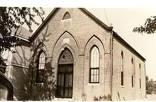 The Jewish congregation of Jefferson City built for themselves a synagogue on the west side of Monroe Street between High and McCarty in 1883. The building is 38 by 25 feet (11.6 m × 7.6 m) and constructed of brick and cut stone trimmings. The interior is neatly furnished and includes a Torah scroll handwritten on parchment. The original Torah written in 1811 is still in use today.[3][5] The Temple was designed by prominent local architect, Frank B. Miller, who also designed the Cole County Courthouse and Central Missouri Trust Company.[6][7] A plaque was placed in the building by the 12 founders in appreciation of women in the Hebrew Ladies Sewing Society who "by untiring exertion and labor have secured and presented to the congregation a house and a lot dedicated to the service of the most high."[3] The wording on the plaque is noteworthy because the women are listed by their first names, which was unusual for the time.