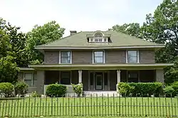The Temple House is a historic house at 1702 South Oak Street in Pine Bluff, Arkansas. It is a two-story brown brick structure, with a low-pitch hip roof and broad eaves typical of the Prairie School of architecture. A single-story flat-roof porch extends across the front, continuing to a form a porte-cochere to the left, with brick piers and low brick wall with stone coping. The house was built c. 1910 to a design by the architectural firm of Theo Sanders.[2]
