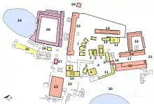 The Temple of the Delians is a peripteral temple in the Doric order, with 6 columns on each short side and 13 columns along each length. The cella is aligned opening to the west with a pronaos and an opisthodomos, both distyle in antis. The temple foundations measure ca. 30 x 13 meters overall.[1]