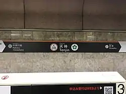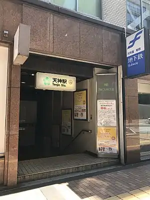 Tenjin Station (天神駅, Tenjin-eki) is a subway station located in Chūō-ku, Fukuoka, Japan. Its station symbol is 5 green dots arranged in a circle, representing a plum blossom, it is Tenmangū (a.k.a.Tenjin)'s symbol. The station is located directly under Meiji-Street (明治通り, Meiji-dōri) in Tenjin, Fukuoka. A large underground shopping mall reaches from Tenjin Station on the Kūkō Line to the Tenjin-Minami Station (天神南駅, Tenjin-Minami-eki) on the Nanakuma Line.