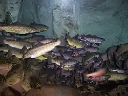 Brook trout, brown trout and rainbow trout on exhibit in River Journey