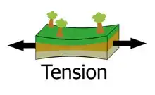 Geologic tension is also found in the tectonic regions of divergent boundaries. Here, a magma chamber forms underneath oceanic crust and causes sea-floor spreading in the creation of new oceanic crust.[3] Some of the force that pushes the two plates apart is due to ridge push force of the magma chamber.[4] Tension, however, accounts for most of the "opposite directions" pull on the plates. As the separating oceanic crust cools over time, it becomes more dense and sinks farther and farther away from the ridge axis. The cooling and sinking ocean crust causes a tensile stress that also helps drive the pulling apart of the plates at the ridge axis.