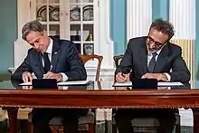 Tent Partnership for Refugees founder Hamdi Ulukaya (right) and US Secretary of State Antony Blinken sign a memorandum of understanding for a public–private partnership in 2022