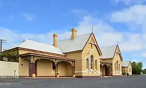 The Tenterfield railway station is a heritage-listed closed railway station and now railway museum located on the Main Northern line, Tenterfield, Tenterfield Shire, New South Wales, Australia. It served the town of Tenterfield and opened on 1 September 1886 when the line was extended from Glen Innes. It was the terminus of the line until it was extended to Wallangarra on 16 January 1888.[1] The railway station was designed by William Murray under the direction of John Whitton, the Chief Engineer of NSW Government Railways, and built during 1886. It is also known as Tenterfield Railway Station group. The property was added to the New South Wales State Heritage Register on 2 April 1999.[2][3] The station has one platform with two loops.