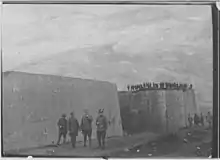 Ali Pasha, a powerful Albanian who originally came from either Tepelena or Beçisht, a village nearby, took control of Tepelena in 1789. He expanded the fortress massively in the early 19th century. On the eastern gate, the so-called Vizier Gate (Albanian: Porta e Vezirit) a Greek inscription mentions the year 1819, however the castle remained unfinished as Ali Pasha died only shortly after in 1822 in Yanya. The main entrance had an Ottoman inscription up until the 1970s when it vanished.[1][2] The castle Ali Pasha built is around 4ha big, the walls reach widths of up to 5m. The castle thrones above the Vjosa Valley and has three gates. The remnants of the walls have a height of around 10 metres. Three polygonal towers have survived, one in the southeast, one in the southwest and one in the northwest. The castle itself is a good exampe of Ottoman castle engineering of the 17th and 18th century. The old Ottoman castle of Bayezid II. which found itself inside the much bigger new castle was used by Ali Pasha as a magazine.[1][2]