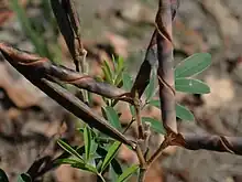 The genus name, Tephrosia, derives from the Greek tephros (ash-coloured) and refers to the fact that most of the species are covered with grey hairs.[6] The species epithet, glomeruliflora, derives from the Latin, glomerulus, (clusters of flowers subtended by a bract),[7] and flos (flower).[8]