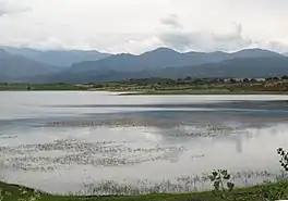 The reservoir has medium biological significance.[8] Flora include sedges (Carex species), yellow fleabane (Dittrichia viscosa), water knotweed (Persicaria amphibia), common reed (Phragmites australis), black poplar (Populus nigra), roses (Rubus species), lakeshore bulrush (Schoenoplectus lacustris), rough bindweed (Smilax aspera) and broadleaf cattail (Typha latifolia).[9] Birds include red kite (Milvus milvus), European bee-eater (Merops apiaster), Eurasian coot (Fulica atra), carrion crow (Corvus corone), grey heron (Ardea cinerea) and great crested grebe (Podiceps cristatus). Amphibians include the pool frog (Pelophylax lessonae bergeri).[10]