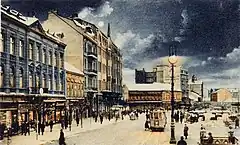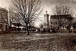 The neighborhood was damaged during the World War I, especially during the heavy Austro-Hungarian bombardment in 1914–1915, prior to occupation. Terazije was described as desolate, empty and destroyed by the grenades. The ground cracked, underground canals collapsed, and the surrounding buildings were demolished. Serbian army had no proper ammunition to fight the Austrian gunboats, so they freely fired at the city from the Sava river.[25] Resident Slavka Mihajlović wrote: "Terazije were completely dug up by the projectiles. Covered in mounds of cobblestone and concrete. Chestnut trees were laying on the ground, uprooted by the shelling. Not a living soul anywhere, like the town has died".[26] Austro-Hungarian army temporarily entered Belgrade, from 3 to 14 December 1914. Already on 4 December they erected gallows on Terazije for hanging civilians.[27]