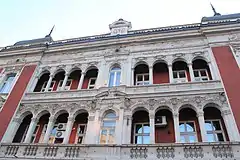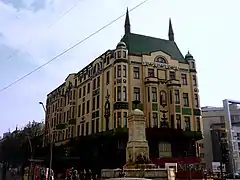 • Hotel Balkan (1935); right across the Hotel Moskva; originally a one-story building built in 1860 on the location of the Simina Kafana, opened by Sima Mehandžija in 1848.[12] It was demolished in 1935 when the present building of the hotel was constructed, work of architect Aleksandar Janković;[30] The old building was also known as the Simina mehana ("Sima's meyhane") and was the gathering point for the volunteers during the Serbian-Turkish wars;[15] Singer Zdravko Čolić recorded a song about the hotel in 2000;[30][65]