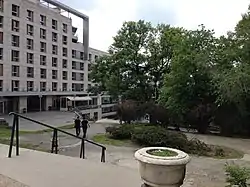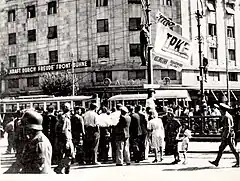 The square and the Palace Albania were hit during the heavy "Easter bombing" of Belgrade by the Allies on 16 April 1944.[42] The palace was fiercely defended by the Germans during the 1944 Belgrade Offensive against the Red Army and Yugoslav Partisan forces. In the evening of 19 October 1944, a Partisan soldier Mladen Petrović placed the Yugoslav flag with red star on the top of the building.[43][44] Taking over the building opened the way for the Partisan army to the Belgrade Fortress, and allowed the charge which liberated the wider area surrounding the Belgrade Main railway station, so just one day later the entire Belgrade was liberated.[45]