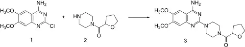 Reaction of piperazine with 2-furoyl chloride followed by catalytic hydrogenation of the furan ring leads to 2. This, when heated in the presence of 2-chloro-6,7-dimethoxyquinazolin-4-amine (1) undergoes direct alkylation to terazosin (3).