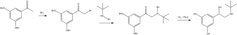 Terbutaline is synthesized by brominating 3,5-dibenzyloxyacetophenone into 3,5-dibenzyloxybromoacetophenone, which is reacted with N-benzyl-N-tert-butylamine, giving a ketone intermediate. Reduction of this product with H₂ over Pd/C leads to terbutaline.[12][13][14]