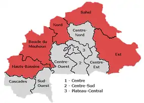 Terrorism in Burkina Faso refers to non-state actor violence in Burkina Faso carried out with the intent of causing fear and spreading extremist ideology. Terrorist activity primarily involves religious terrorism conducted by foreign-based organizations, although some activity occurs because of communal frustration over the lack of economic development.[2][3] Recent attacks have concentrated in the Hauts-Bassins, Boucle du Mouhoun, Nord, Sahel, and Est regions, along the border with Mali and Niger.[4] A series of attacks in Ouagadougou in 2016, 2017, and 2018 by al-Qaeda in the Islamic Maghreb and its affiliates garnered international attention.[5][6][7]