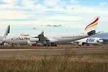 Teruel Airport (IATA: TEV, ICAO: LETL) is an airport near Teruel in the Teruel Province of Spain. Known under the commercial name Plataforma Aeroportuaria-Teruel (PLATA), it was certified for public use by the Spanish Aviation Safety and Security Agency (AESA) on 5 February 2013, after being repurposed from an original military airbase. Permission for air operations was granted by the AESA on 28 February 2013.[1] The airport serves as an aircraft maintenance and aircraft storage facility for the Tarmac Aerosave company, and has no passenger traffic.