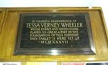 A black marble memorial plaque to Tessa Wheeler was unveiled at the Institute of Archaeology in 1937. A biography was published by Lydia Carr in 2012.[1]