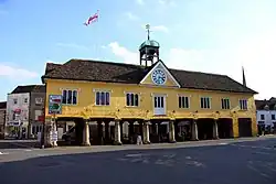 The current building was commissioned by the local feoffees to replace a medieval market house: the new building was designed in the neoclassical style, built with a timber frame and a stucco finish and was completed in 1655.[2] The design involved a symmetrical main frontage with seven bays facing onto the Market Place; it was arcaded on the ground floor, so that wool and yarn markets could be held, with an assembly room on the first floor.[3] On the ground floor, there were three rows of seven Tuscan order columns which supported the first floor, which was fenestrated by two-light mullioned windows and surmounted by a central pediment with a clock in the tympanum.[1]