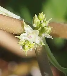 The annual herb has a prostrate habit that typically grows to a height of 3 to 20 centimetres (1.2 to 7.9 in). It blooms between August and October producing yellow-green flowers.[1]