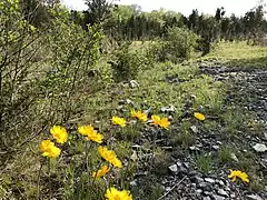 The USFWS 2016 final ruling as a part of its Five year Review of recovery efforts for the Lakeside Daisy identified threats to survival as habitat destruction, succession of competitive overgrowth by woody species, over-acting for gardens, inadequacy of existing regulatory mechanisms, and self-incompatibility.[10] Since the Lakeside Daisy requires a strictly dry, limestone-based habitat, climate change is likely to have a significant impact on existing natural populations. As quarry operations continue in these habitats, the areas best suited for Lakeside Daisy growth will likely fill with water and develop into small lakes.[11] These changes to the natural habitat, if unchecked, will eradicate some of the plant's most populated centers. Historically, alvar habitat cannot be unnaturally created, and even attempts to restore altered land have not led to successful, diverse ecosystems.[12] In an effort to help nearby land be more suitable for the plant to expand, wooded areas specifically near the Ohio populations may require management and clearing. On a positive note, once a proper site is populated, competition with other species is limited since few other plants can thrive in the alvar ecosystems.[10] Nonetheless, in recent years Lakeside Daisies have faced competition from native prairie plants, which often create a dense organic layer of soil. This presents a problem for the daisy by reducing sunlight and adding soil suitable for more competitive plants.[13] Through observation as part of the Recovery Plan, bumble bees, small carpenter bees, and halictid bees have been recorded as pollinators for the daisy. A few other species of insects, including the Pearl Crescent butterfly have been found to pollinate Lakeside Daisy flowers.[14] The role of these insects has been shown to be impactful, specifically with the smaller populations of the plant, in combatting the natural struggle with self-incompatibility. A 2007 study found that although the small populations of the Lakeside Daisy suffer from a lack of mates, they are more frequently visited by pollinating insects. Thus, despite population size. the Lakeside Daisy is rarely found to be pollen limited.[15]