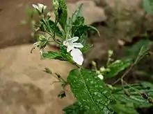 Teucrium corymbosum, commonly known as forest germander,[2] is a species of flowering plant in the family Lamiaceae and is native to Australia and New Guinea. It is a perennial herb or subshrub densely covered with glands and with narrow egg-shaped leaves usually with toothed edges, and groups of mostly up to ten white flowers.