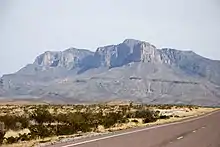 North of town, the route passes through a gap between the Beach Mountains and the Baylor Mountains and then emerges onto a large salt basin. The route follows the western edge of the basin east of the Sierra Diablo and the Texas Parks and Recreation Department's Sierra Diablo Wildlife Management Area until the route reaches its northern terminus at US 62 and US 180 between Salt Flat and Pine Springs near Guadalupe Mountains National Park. Between Van Horn and its northern terminus, the route is isolated encountering no major intersections.[21][22] Beyond Van Horn, the only community along the route is the ghost town of Daugherty 30 miles (48 km) north of town.[23]