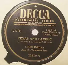 "Texas and Pacific" is a song written by Jack Wolf Fine and Joseph E. Hirsch. It was performed by Louis Jordan and his Tympany Five, recorded in October 1946, and released on the Decca label (catalog no. 23810-A).[2] The song describes a rider's experience on the Texas & Pacific Railway.[3] The "B" side of the record was "I Like 'Em Fat Like That".[4]