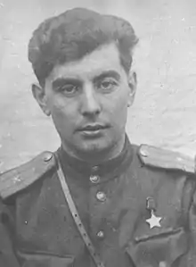 After being drafted into the Red Army he attended the Orel Infantry School before being deployed to the warfront upon the German invasion of the Soviet Union with the rank of junior lieutenant as part of the 412th Rifle Regiment. He saw combat on the Western, Don, South-Western and Steppe fronts. He was seriously wounded twice during the second half of 1941, and by the end of 1941 he was promoted to position of battalion commander. After graduating from a sharpshooting course in 1942 he was continued to serve as battalion commander until he was seriously wounded again in December. That same year he joined the Communist party.[2][3]