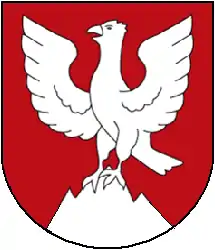 The blazon of the municipal coat of arms is Gules a Falcon Argent displayed statant on a rock issuant of the same.[4]