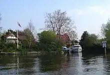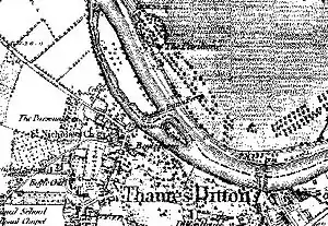 Before Hampton Court Bridge a ferry to Hampton Court served Oatlands Palace and the western third of Surrey, laden with carriages and carts. This lane ran northwards along Thames Ditton High Street, over what is now a public slipway where the river is wide, and at lowest water through the ford to the other side. When the tide was in, ferrymen would charge a groat or two.[2] In heavy flows the river came to tidal slack water often locally; this fertilised the broad banks of flood-meadows and flooded the island and ferry in winter. Controlled flows resembled the modern level by early 19th century as any agricultural benefit was outweighed by the homes of those near the river engaged in more modern forms of work.