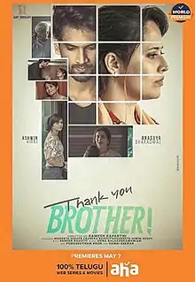 Thank You Brother is a 2021 Indian Telugu-language thriller film written and directed by Ramesh Raparthi.[2] Produced by Magunta Sarath Chandra Reddy and Tharaknath Bommi Reddy, the film stars Anasuya Bharadwaj and Viraj Ashwin in primary roles.[3] The film premiered on Aha on 7 May 2021.[4] Music of the film is composed by Guna Balasubramanian. The film is an official remake of the 2019 Nigerian film Elevator Baby.[5][6][7]