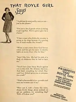 That Royle Girl is a 1925 American silent comedy film directed by D. W. Griffith and released by Paramount Pictures. The film was based on the novel of the same name by Edwin Balmer, and starred Carol Dempster, W. C. Fields and Harrison Ford. It is now considered lost.[2][3]