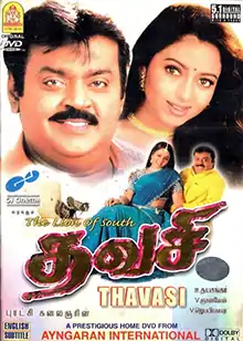 Thavasi is a 2001 Indian Tamil-language action drama film directed by K. R. Udhayashankar starring Vijayakanth in dual lead roles as father and son, with Soundarya, Vadivelu, Jayasudha, Prathyusha, Nassar and Sriman playing other pivotal roles. The film released on 14 November 2001 and received mixed reviews from the critics but was a hit at the box office. It was also dubbed into Telugu as Ramanaidu and in Hindi as Aaj Ka Krantiveer.[2] The film was remade in Kannada as Mallikarjuna.[3]