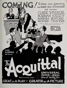 The Acquittal is a 1923 American silent mystery film based on the play of the same name by Rita Weiman. The film was directed by Clarence Brown, who would later start a long career at Metro-Goldwyn-Mayer. The film stars Norman Kerry, Claire Windsor, Richard Travers, and Barbara Bedford. The film was released by Universal Pictures.[1]