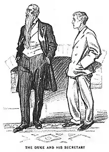 The next morning, they go to Holdernesse Hall, where they find that the Duke is not well. Nevertheless, Holmes demands from him a cheque for £6000 (equivalent to £692,992 in 2021[2][3]), saying that he has earned the reward. His son is at the Fighting Cock, and the accused is the Duke himself, but the actual mastermind of this crime is James Wilder, who has a terrible secret: He is the illegitimate son of the Duke. He conceived a plan to kidnap Lord Saltire to force the Duke to change his will, knowing very well that his father would not call the police on him, as he abhorred the very idea of scandal. The plan had begun to unravel when Wilder hired Hayes – who has now fled, but been caught on Holmes's information – to do the actual kidnapping. Hayes had killed Heidegger, and when Wilder heard the news, he confessed all to his father. So anxious had been the Duke to avoid scandal, he agreed to let his younger son remain confined at the inn for another three days, and to keep quiet, so that Hayes could flee justice.