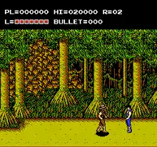 In Stages 2 and 7, the game adopts a rail shooting format viewed from a first-person perspective, which can be played with a standard controller or with an NES Zapper, depending on the mode chosen by the player before the start of the game. In these stages, the player must shoot as many gunmen as possible and then destroy the boss at the end of the stage without running out of health or ammunition. Certain enemies will drop additional ammo and health kits, as well as other power-ups such as an hourglass that gives Billy unlimited ammo for a limited period, a bulletproof vest that leaves him invulnerable for a while as well, and a star that destroys all present enemies.