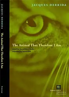 The Animal That Therefore I Am (French: L'Animal que donc je suis) is a book based on the ten-hour address on the subject of "the autobiographical animal" given by the French philosopher Jacques Derrida at the 1997 Cerisy Conference and subsequently published as a long essay under the title, "The Animal That Therefore I Am (More To Follow)". The book has gained notability as signalling Derrida's turn to questions surrounding the ontology of nonhuman animals, the ethics of animal slaughter and the difference between humans and other animals. Derrida's lecture has come to be a foundational text in Animal Studies within the fields of literary criticism and critical theory.[1] Whilst the text is often seen as marking the "animal turn" in Derrida's oeuvre, Derrida himself said that his interest in animals was in fact present in his earliest writings.[2]