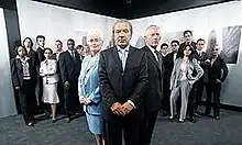 Promo group shot of Alan Sugar, Nick Hewer, and Margaret Mountford standing before the candidates for series 1