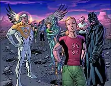 The Authority, as featured on the cover for the Under New Management trade paperback (Nov. 2000). From left to right, the Doctor, Swift, Apollo, Jenny Sparks, Midnighter, the Engineer, and Jack Hawksmoor, with the infant Jenny Quantum at the back. Art by Frank Quitely.